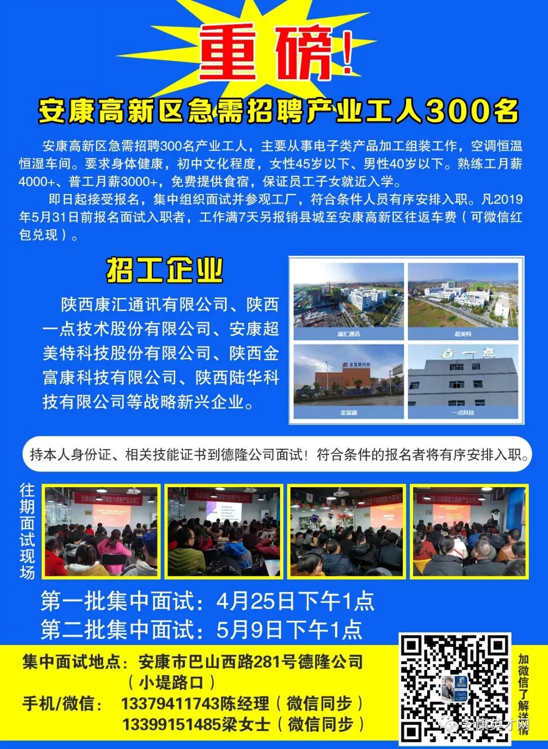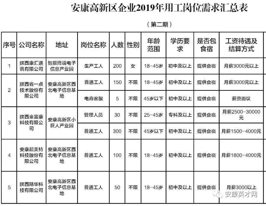 安康高新區(qū)2019年全年用工需求約1萬人,截止3月底已招聘上崗4000余人,當前崗位主要包括普通工人、技能工人、車間主任等。重點企業(yè)用工需求信息如下: