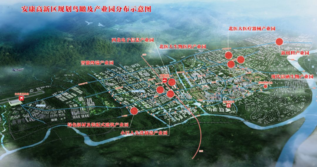 安康高新區(qū)規(guī)劃鳥瞰及產(chǎn)業(yè)園分布示意圖