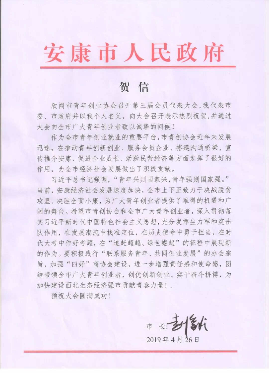 本次大會從籌備到召開,得到了市委、市政府的高度重視和關心,得到了各部門的精心指導和幫助,安康市青年創(chuàng)業(yè)協(xié)會今后將緊緊圍繞市委、市政府中心工作,堅定踐行“聯(lián)系服務青年、共同創(chuàng)業(yè)發(fā)展”的宗旨,引導全體會員“愛黨、愛國、敬業(yè)、創(chuàng)新、誠信、守法、貢獻”,為我市綠色崛起、追趕超越、建設西北生態(tài)經濟強市、圓滿完成脫貧攻堅任務做出新的更大貢獻!