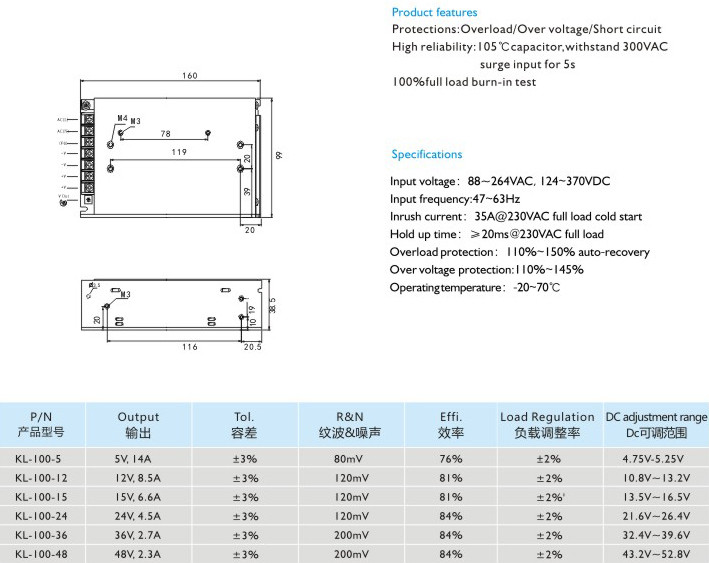 高可靠性:105C長壽命電容,能承受300VAC輸入電壓5秒不損壞 100滿載老化測試 輸入電壓:88-132VAC,176-264VDC,249-370VDC 輸入頻率:47~63Hz 沖擊電流:35A@230VAC滿載冷態(tài) 保持時間:≥20ms@230VAC滿載 過載保護:110%-150%自動恢復(fù) 過壓保護:110%~145% 運行溫度:-20-70℃" />